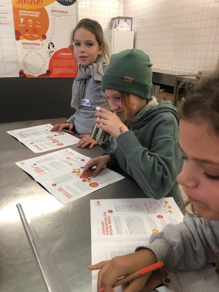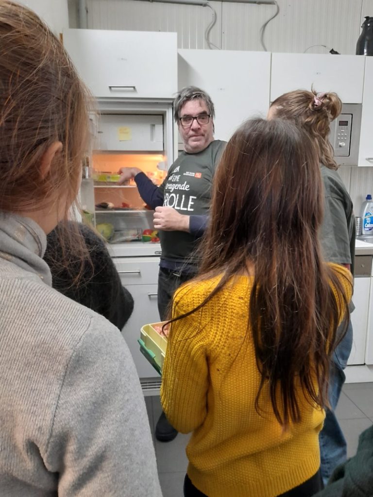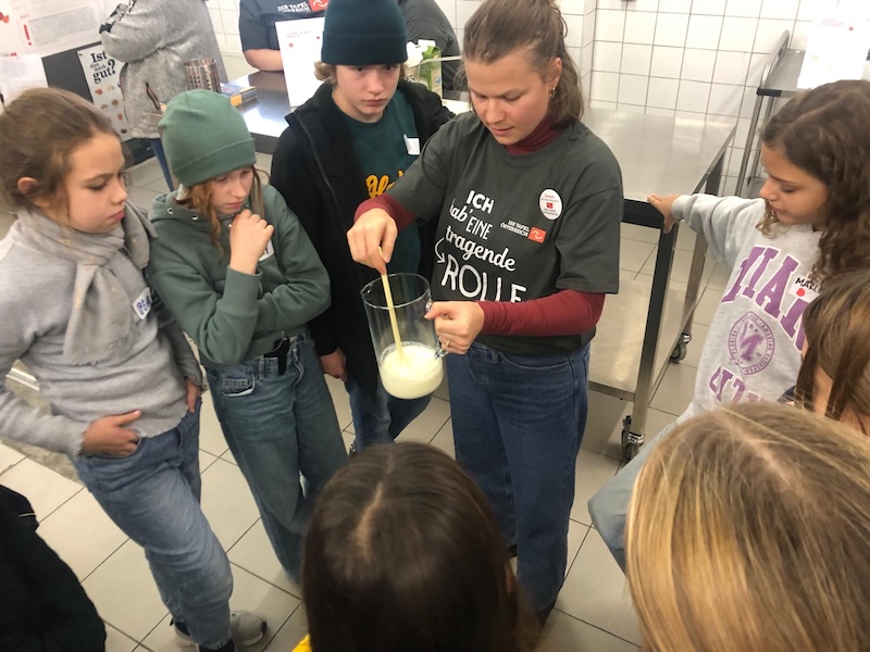 Der Klimaclub besuchte das Tafelwerk am Wiener Großmarkt, eine Kooperation der Tafel Österreich mit Jugend am Werk. Im Sensoriklabor lernten die Schüler:innen, wie man die Qualität von Lebensmitteln mithilfe der fünf Sinne beurteilen kann. Bei Blindverkostungen ordneten die Jugendlichen verschiedene Geschmacksproben zu und testeten ihre Wahrnehmung bei Geruchsproben. Außerdem verkosteten sie Joghurt in unterschiedlichen Reifestufen – ein praktisches Beispiel dafür, dass viele Produkte oft deutlich länger genießbar sind als man annehmen würde. Mit Mikroskopen untersuchten die Schüler:innen das sichtbare Verderben von Lebensmitteln, indem sie das Myzel verschiedener Schimmelpilze beobachteten. Damit es jedoch gar nicht erst zum Verderben kommt, übten die Teilnehmer:innen auch das richtige Einräumen des Kühlschranks, abgestimmt auf die unterschiedlichen Temperaturzonen. Außerdem lernten sie eine weitere Möglichkeit zur Haltbarmachung kennen – die Herstellung von Topfen und Molke aus Milch. Sensoriklabor der Tafel Österreich: https://tafel-oesterreich.at/sensorik-labor/